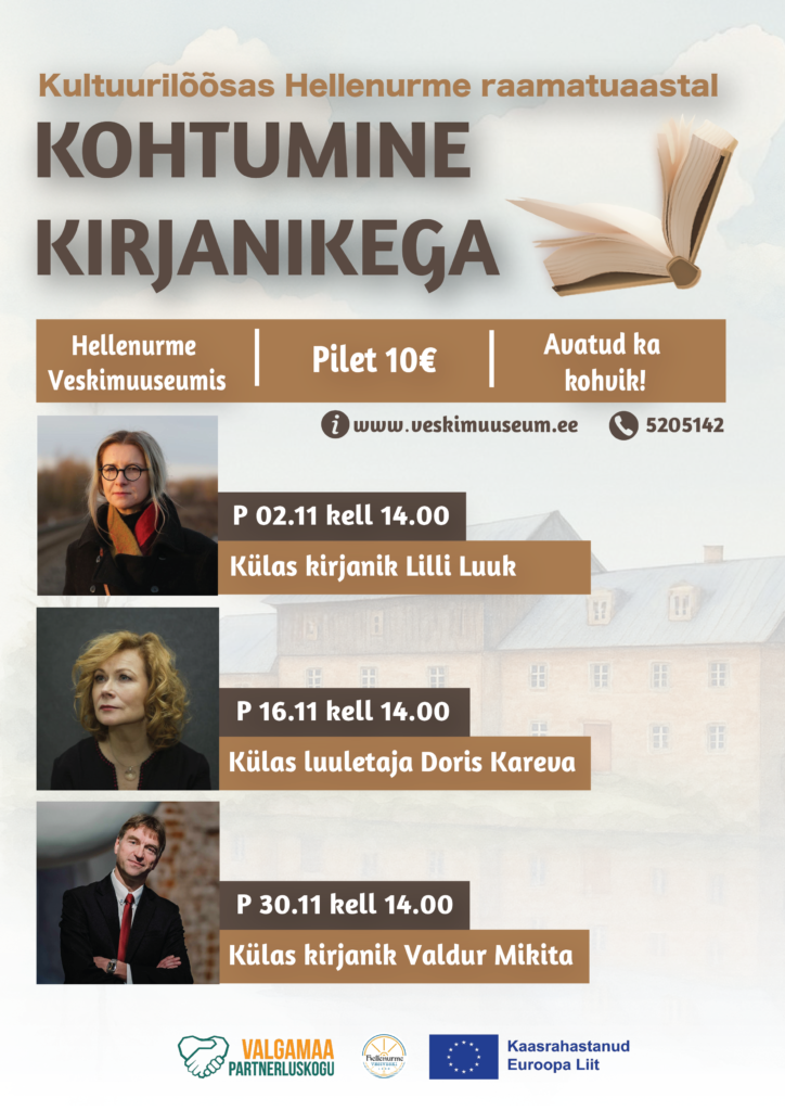 Kultuurilõõsas Hellenurme lõõmab edasi sügisel, siis, kui tuuled puhuvad ja vihma rabistab. Veskisse tulevad viiel pühapäeva pealelõunal külla tuntud ja tunnustatud kirjanikud. Esimesed kaks on teie ees: